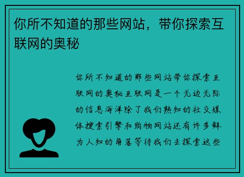 你所不知道的那些网站,带你探索互联网的奥秘   互联网是一个无边无际的信息海洋,除了我们熟知的社交媒体、搜索引擎和购物网站,还有许多鲜为人知的角落等待我们去探索。这些网站不仅丰富了我们的网络体验,还能...